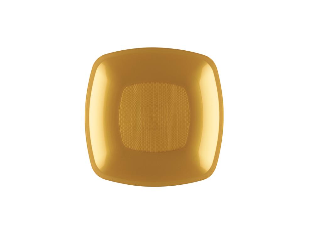 Piattino dessert quadrato in PP oro. Dimensioni: 180 x 180 mm. Confezione da 25 pezzi.